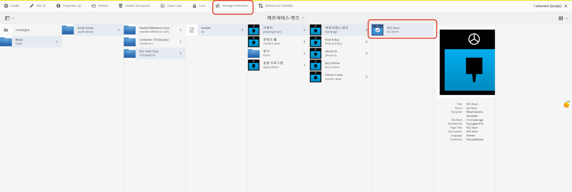 11. 해당 페이지 생성 완료 후, Publish를 진행합니다. (이 후 페이지 링크 연결 방법은 기존과 동일합니다.)