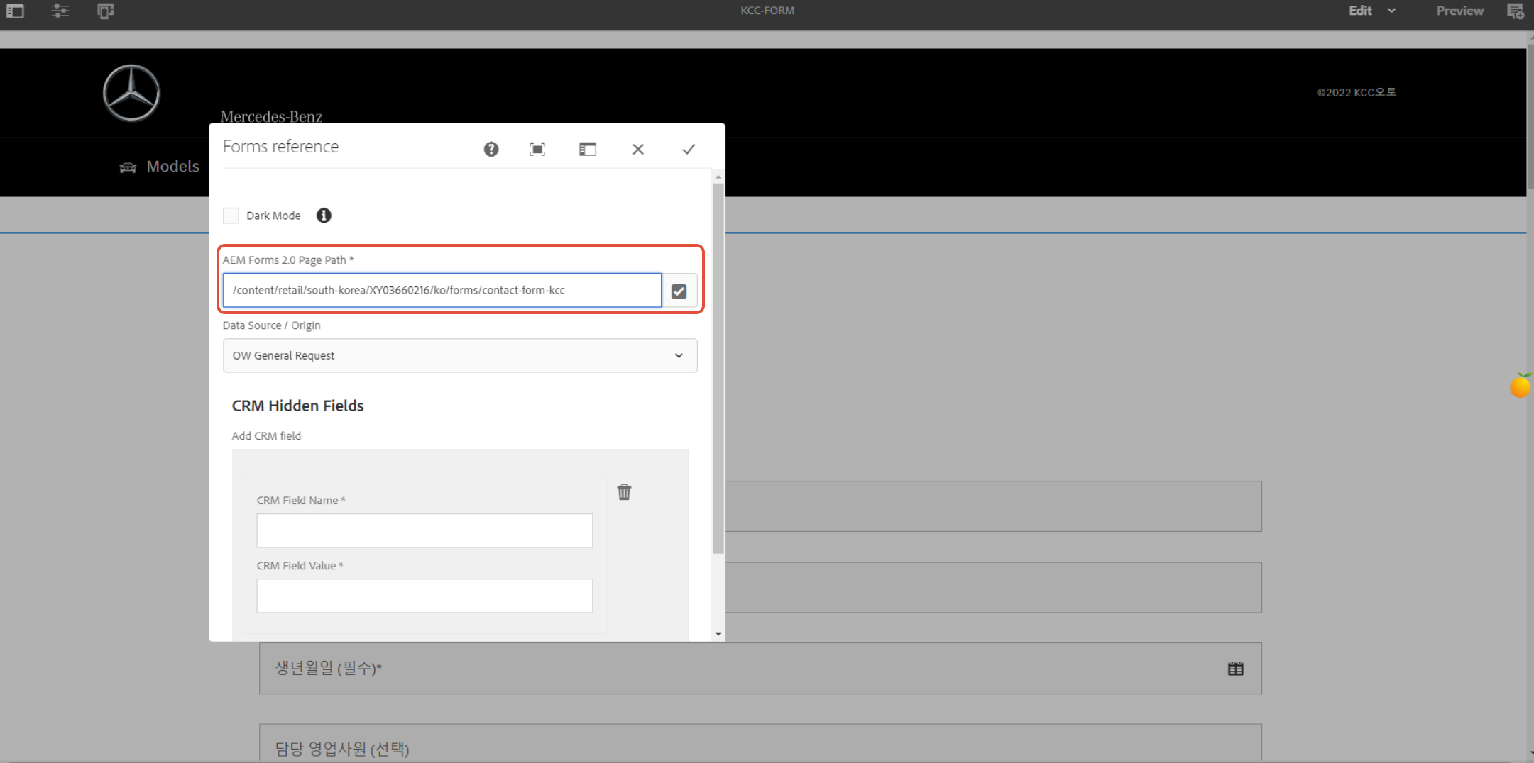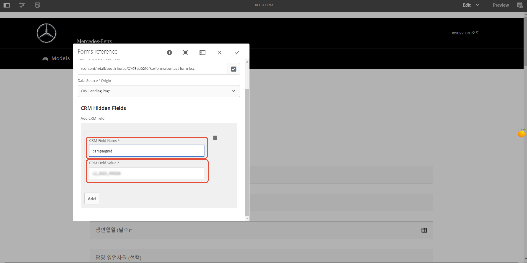 8."CRM Hidden Fields"를 Add한 후, "CRM Field Name" , "CRM Field Value"를 설정합니다.